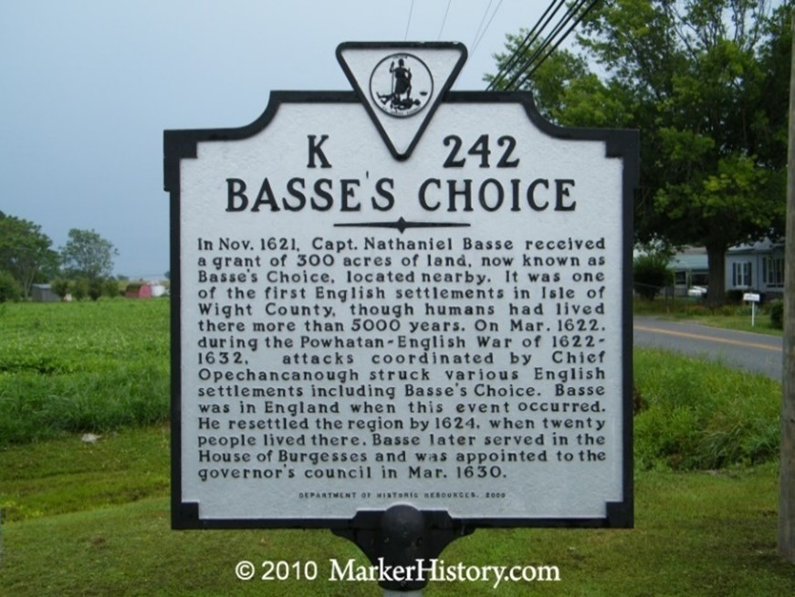 Basse’s Choice Plantation marker. This marker is on Virginia Route 10 just south of the intersection with 1402, on the left when traveling south. On the south side of the James River.