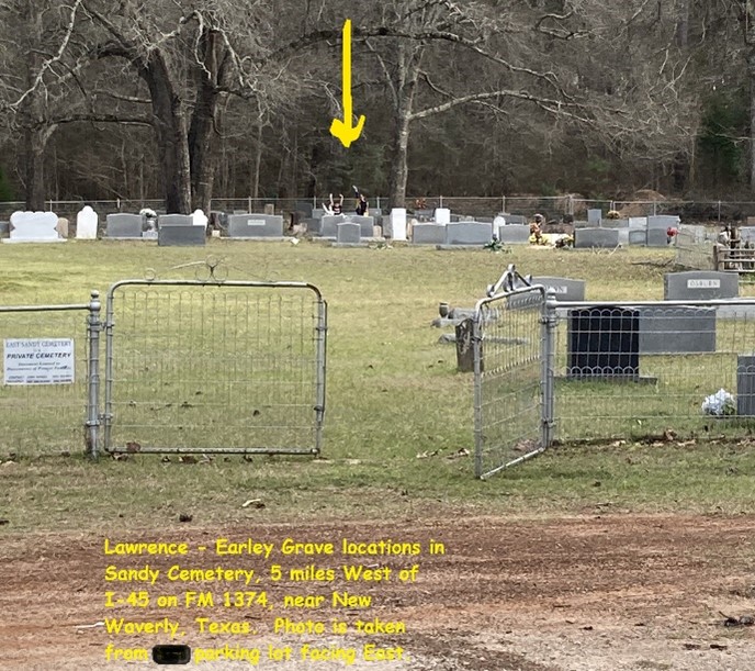 East Sandy Cemetery, New Waverly Texas. The cemetery is 5 miles west of I-45 on FM 1374. This photo shows the locations of the graves.