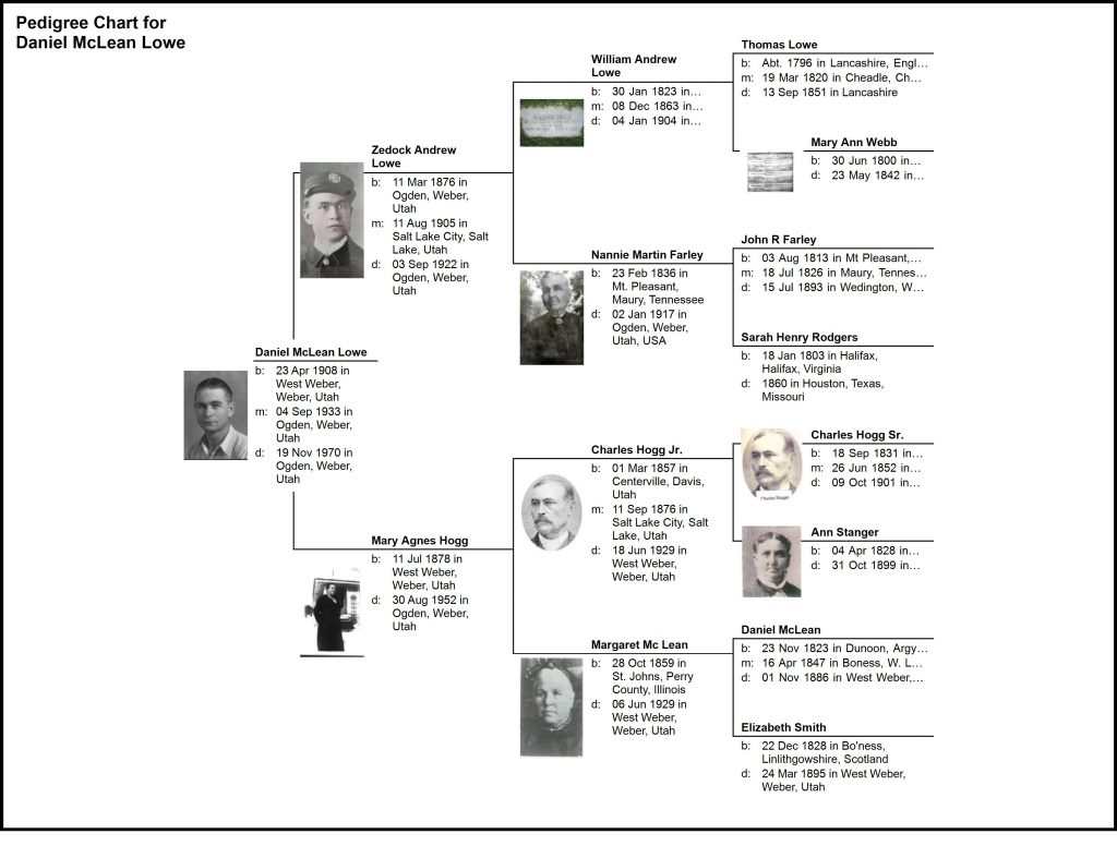 Zedock Andrew Lowe, son of William Andrew Lowe and Nannie Martin Farley was born 11 Mar 1876 in Ogden, Utah. He married Mary Agnes Hogg, daughter of Charles Hogg Jr. and Margaret Mc Lean on 11 Aug 1905 in Salt Lake City, Utah.