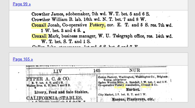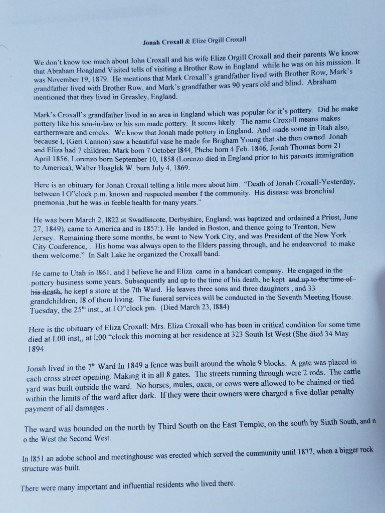 Jonah was a potter in England. The name Croxall means to make crocks and pots. Jonah Croxall was one of a group of Staffordshire potters operating in Salt Lake City from the 1860s to 1880s. He was a co-owner of City Pottery during that time.