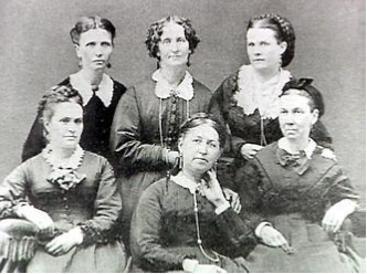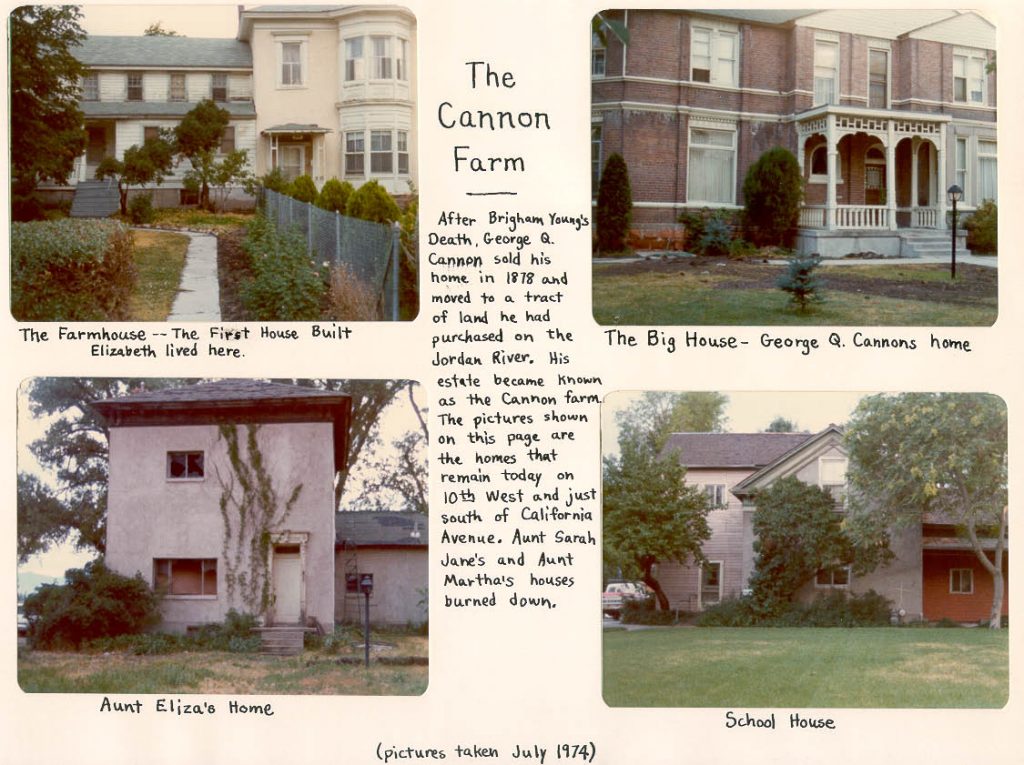 The image below is of the George Q. Cannon Farm Houses and Wives. Our ancestor is Elizabeth Hoagland shown second from the right. This property is south of the Salt Lake City downtown area on the Jordan River on the West side of 1000 West St., immediately South of California Ave. (1330 South). The city has developed around it, but some of the houses still stand. The house on the far right of this picture is still there, (on the southwest corner of the modern day intersection) Elizabeth’s is not, and some of the buildings on the left side of this picture are still standing.