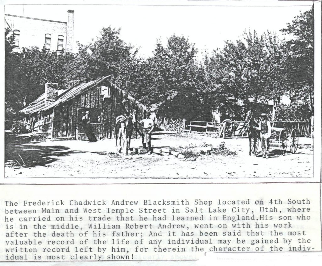 The family home was on the North side of South 400 St. between 200W and S. Temple, two blocks east of Pioneer Park. They were members of the original 7th Ward along with their future son-in-Law Richard Andrew. Richard’s family blacksmith shop and home were at the corner of 400 South and Main Street.