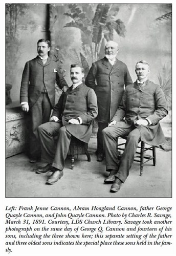 In 1880, three years after the death of Brigham Young, the First Presidency was reorganized with John Taylor as president and George Q. Cannon as first counselor. Cannon remained first counselor in the two subsequent administrations of Wilford Woodruff and Lorenzo Snow. During those years, his entrepreneurial aptitude became manifest. Before his death in 1901, at the age of seventy four, Cannon had been associated with more than sixty Utah commercial, mercantile, and industrial businesses. His devotion to his family, his church, and his religion are an important legacy he left to the world.”