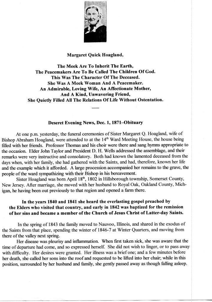 Margaret Quick, daughter of James Quick and Maria Hagerman was born on 18 Apr 1802 in South Branch, Somerset, New Jersey. She died on 01 Nov 1871 in Salt Lake City, Utah.