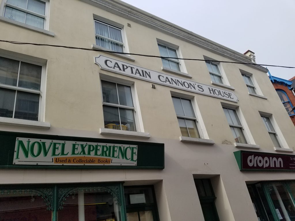Among those who thus came once more into good repute with the officials was our gallant Captain Cannon. Before making peace with them, however, he had led them many a merry chase, as had his confreres and compatriots of the tight little Island port. To this period belongs a noticeable architectural feature of so many of the residences of Peel. The town was in fact a storehouse magazine for foreign skippers to deposit vast quantities of East Indian and other goods that were then carried away by the smaller Manx vessels into Scotland, England, Wales, and Ireland, to the manifest detriment of the revenue. A writer of those times comments upon “the strange delight” the inhabitants took in “subterraneous dwellings”; there was hardly a building that had not “at least an equal number of rooms below ground as above it.” Captain Cannon’s house, still standing, was one thus constructed; and we may well imagine that in the days of his greatest contraband activity his underground apartments were well filled with curious and precious products from distant parts of the globe. Today are still to be seen the large cellar windows through which the casks of smuggled wine and bales of goods were lowered into their place of storage in his roomy basement; and we can easily picture him, on dark, tempestuous nights, when the well-equipped cutters of the revenue service would make for shelter, putting out unafraid to sea. The seamanship involved in such hazardous business was magnificent and worthy of the best of causes. The personal daring also was superb. It is related to one of these commanders, a contemporary of Caption Cannon’s, that, being surprised at anchor in harbor he promptly weighed anchor, bore down between the two cutters so close that he tossed his hat on one deck and his wig on the other, hoisted a cask on his maintop to show his occupation, and under a great spread of canvas showed his would-be captors a clean pair of heels.