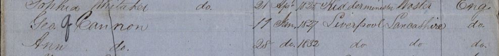 “George Cannon, the eldest son of Hugh and Eleanor Addy Cannon and the father of George Cannon the Immigrant, is the most picturesque and romantic figure in our history. He was born in Peel (Isle of Man) in May, 1766, and died at sea on board his own ship, July 19, 1811, being the victim of a mutiny which he was endeavoring to suppress among his crew, and which would have been suppressed without his death had his loyal subordinates been as prompt and courteous in meeting the outbreak in its incipiency as they were later severe in punishing the guilty participants.