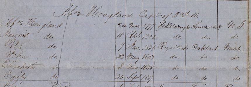 Abraham Lucas Hoagland, son of Lucas Hoagland and Mary Bunn was born on 24 Mar 1797 in Hillsborough, Somerset Co., New Jersey. He died on 15 Feb 1872 in Salt Lake City, Utah. He married Margaret Quick, daughter of James Quick and Maria Hagerman on 24 Nov 1825.