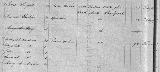 February, 1855, the Faceby Branch was broken up by the saints all leaving, nearly all coming to Utah. As president, of said Branch, I delivered up books with Branch record to Elder Smith, traveling elder in that part. Left this part of the world Feb. 14, 1855, with a conscience void of offence toward God and all men, free from debt to anyone. I visited father, mother, and what family there were at home here at Deighton, Yorkshire, England. Ten of us in family were all born in the same house. I could not stay with my beloved father and mother but a few minutes, bid them goodbye, off to catch the train. Here left father, mother, five brothers, four sisters for to gather with the people of God to the Mountains of Ephraim. Thia was Feb. 14, 1855, and stayed here until Feb. 27. Two of my sisters lived here and were very kind to myself and family which consisted to myself, wife, and child eighteen months old – James. We embarked on the ship Liddon, chartered by F. D. Richards, President of the British Mission. Captain of the ship was Wm. Taylor; President of the Company was J. S. Fulmer, a returning missionary from Utah. The passage was very long and rough with storms and head winds. Had 400 souls on board; has sea sickness very bad for nine days. Provisions were very scarce; the last three weeks had very little water. I had provided plenty for my family of our own to last us across the ocean, but we divided the last biscuit with our brethren and sisters. We lived three weeks on rice and butter, oatmeal, and had very little water to cook it with.