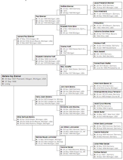 Ethel Gertrude Berens (1916-1992) married Paul Brenner (1912-2007) October 28, 1936 in Grand Rapids, Michigan.  Her grandfathers, Harm Berens and Willem Lomholder, were 19th century German immigrants to Michigan.  Harm Berens was from Lower Saxony, Germany and came to Michigan sometime before 1883.  Willem Lomholder and family arrived in 1865, also from Lower Saxony.  Her maternal grandmother, Caroline Dendel was born in Michigan, but her parents, Peter and Dorothea arrived a few decades earlier, in 1837 from Schleswig-Holstein, Germany.