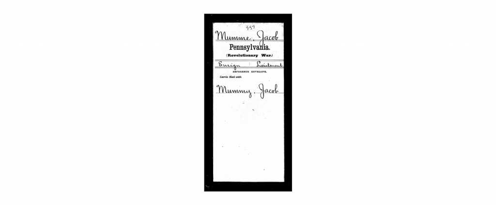 Samuel’s son John Jacob Moomey fought in the American Revolution. Below is an image of his service record cover page held in the national archives: