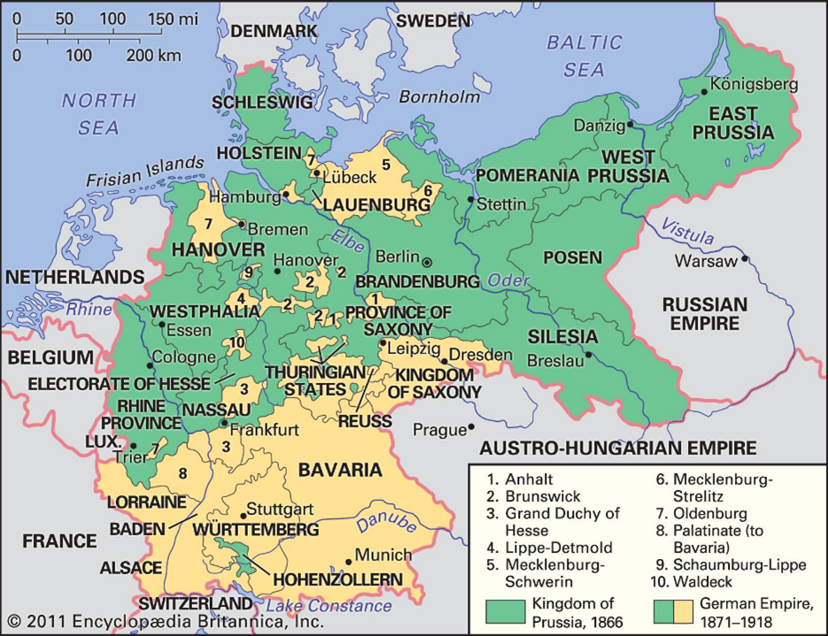 The map below shows the states and principalities that later became Germany: