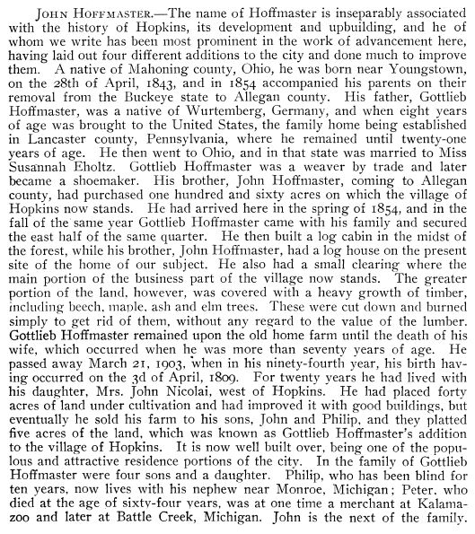 The Hoffmasters arrived in America in 1817 and settled in Mahoning County, Ohio. In 1854 the family relocated to Michigan.
