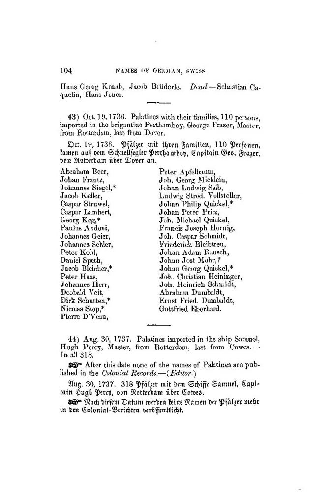 1736 Palatine Immigration list – Quickel is 6th from the bottom on the right column