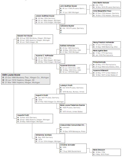 Johann married Susanna Hoffmaster in Michigan, July 3, 1864.  Their son Edward Karl married Augusta Knuth. The Knuth family arrived from Prussia in the 1870s. Augusta’s grandparents Ludwig and Marie Knuth migrated from Prussia, first.  They left their son August in Germany and came to North America in 1857, arriving in Quebec and later settling in Bureau, Illinois.  August married in Germany and the family emigrated to Michigan where their daughter, Augusta married into the Nicolai family.