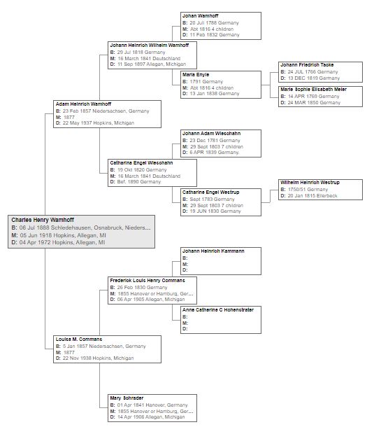 Johann, Heinrich, and Charles Wamhoff were born in Osnabruck, Lower Saxony, Germany.  Henry (Heinrich) married Louisa Commans in 1877.  Louisa’s parents, Frederick and Mary Commans, later immigrated from Hanover to Michigan arriving on April 29, 1882.  Eight years later the three generations of Wamhoffs joined their in-laws sailing from Bremen in Germany and then from Southampton England arriving in New York May 13, 1890, on the ship “Werra”, and settling in Allegan County, Michigan, near the Commans family.